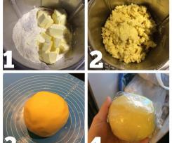 - Wyciągamy ciasto z zamrażarki, kroimy je na 4 części. Każdą część zagniatamy w kulkę, którą nastepnie cienko rozwałkowujemy (zachowując kształt koła) i dzielimy na 6 lub 8 części kształtem przypominajacych trójkąt - w zależności od tego czy chcemy duże rogaliki czy mniejsze. Na szerszym końcy każdego kawałka smarujemy trochę nadzienia, a następnie zwijamy go w rulon, lekko dociskając po bokach, aby utworzyć kształt rogalika. Powtarzamy z całością ciasta, tak jak tutaj: