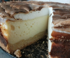 "Ciasto" wyłozyc na tortownicę sr.27cm i ugniatając palcami uformować do dna lekko na brzegi nalozyćdo naczynia włozyć ser,żółtka,cukier,mleko,mąka,olej i wyrobić na poczatku przy pomocy kopystki 30s/obr5 po tym czasie nałozyc miarkę zmiksować 1.30min/obr6,masę wylać na spód ciasta,wstawic do piekarnika nagrzanego 180st góra i dół i piec 40st potem wyjac i wyłozyc na ciasto bezę i włozyc do piekarnika na 15min mozna zmniejszyc temp do 150st ja tego nie zrobiłam