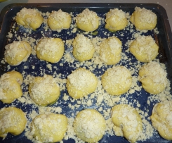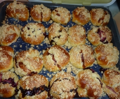 Ciasto przekładamy do miski, zamykamy lub przykrywamy sciereczką i odstawaimy do wyrosnięcia na 1 godzinę. Nastepnie na wysypaną mąką stolnice wykładamy ciasto, dzielimy je na dwie części, formujemy rulon i kroimy go na 10 części, każdą część rozwałkowujemy na owalny placek, tak samo postępujemy z drugą częścią. Na każdy placek nakładamy ulubiony dzem lub marmoladkę, i sklejamy podobnie jak pierogi formując kulkę. Bułeczki układamy na wyłozoną papierem blaszkę - wychodzi 20 sztuk bułeczek, i odstawiamy jeszcze na 30 minut do wyrośnięcia, następnie smarujemy bułeczki rozbełtanym jajkiem i posypujemy kruszonką. Bułeczki pieczemy w nagrzanym piekarniku do 190 stopni przez 25 minut.
