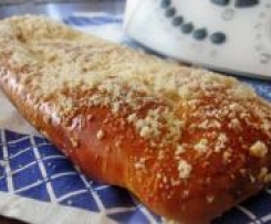 "Ciasto" .Ciasto wyjąć podzielić na 3 porcje. Rozwałkować i posmarować masą serową. Zwinąć jak roladę. Posmarować jajkiem i posypać kruszonką.