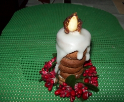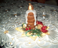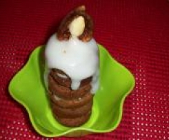 Na środku pierwszego kółka mocujemy patyczek, smarujemy odrobiną lukru i nakładamy następne kółeczko itd…. aż do żądanej przez nas wysokości świeczki. Oblewamy lukrem . Z przekrojonych suszonych fig i migdałów robimy "płomyk".