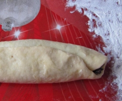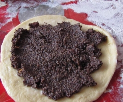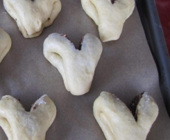 "Ciasto" .wyjmujemy na stolnicę posmarowaną olejem,przykrywamy ściereczka i czekamy aż wyrośnie[30min.]. Dzielimy ciasto na 16 kulek,walkiem robimy placki,nakładamy łyżeczkę masy makowej,zwijamy w rulon,składamy na pół,układamy na blaszce wyłożonej papierem,przecinamy nożem ,rozchylamy tworząc serduszko