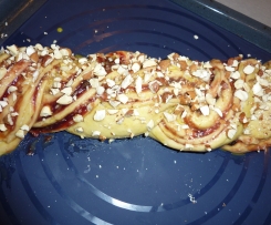 Na wysypanej mąką stolnicę wykładamy ciasto i wałkujemy na owalny, prostokatny placek, smarujemy marmoladą, posypujemy wiórkami i rodzynkami i zwijamy jak roladę, odcinamy kawałek ciasta z dwóch stron (dosłownie końcówki), nastepnie nalezy przekroić rulon posrodku wzdłuż, ale nie do końca, z dwóch powstałych pasków pleciemy warczocz, odcięte kawałki ciasta umieszczamy na końcu i na poczatku. Tak przygotowany warkocz przekladamy na wyłożoną papierem blaszkę i zostawiamy jeszcze 1 godzinę do wyrośnięcia, następnie smarujemy rozkłóconym jajkiem i posypujemy migdałami, pieczemy w nagrzanym piekarniku do 180 stopni przez czas 30-40 minut do zarumienienia.