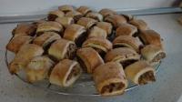 1. ciasto podzielić na 3 części, każdą z nich rozwałkować tj. na pierogi, na brzegu rozwałkowanego ciasta położyć 1/3 farszu, zwijać jak naleśniki,następnie kroić na 3-4cm kawałki, układać na blachę wyłożoną papierem, i smarować rostrzepanym jajkiem