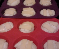 "Blokada naczynia miksującego" ciasto i dzielimy jak bułki na porcje .Ja podzieliłam na małe porcyjki.Ręką rozpłaszczyć na placuszki wyłożyć foremki i nałożyć po łyżeczce farszu zamknąć (skleić ) górę jak się rozkleja to położyć na wierzchu dwa paseczki żółtego sera