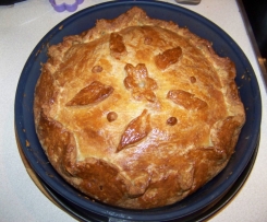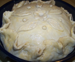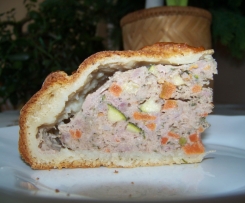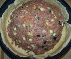Z 2/3 ciasta rozwałkować koło o średnicy 26 cm. Blachę posmarować oliwą, położyć ciasto, posypać 2 łyżkami tartej bułki. Przenieść na środek masę mięsną uformowaną w okrągły bochenek ( tak, żeby wokoło zostało 5 cm ciasta). Resztę ciasta rozwałkować na koło o średnicy 22 cm i przykryć nim farsz. Zawinąć do góry brzeg dolnej warstwy ciasta, połączyć płaty lekko je dociskając. Na środku zrobić dziurkę. Posmarować pasztet żółtkiem i piec 60 min w temp. 175*C
