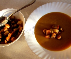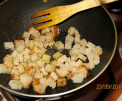 W tym czasie kroimy bulki na mała kostke, w glebokiej patelni rozpuszczamy maslo i wrzucamy koteczki bulek. Obsmazamy az beda chrupiace grzanki.