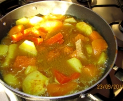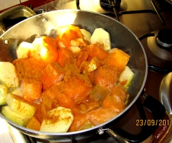 Na duza patelnie wlewamy oliwe. Czosnek i cebule kroimi w kosteczke i wrzucami na nagrzana oliwe. Lekko podsmazamy (uwaga nie za mocno zeby czosnek nie byl gorzki!). Dorzucamy pokrojone ziemniaki i dynie i podsmazamy. Gdy dynia pusci sok dolewamy bulionu (ilosc wg upodoban co do gestosci zupy i w zaleznosci od tego jak soczysta byla dynia). Dusimy wszystko do miekkosci pod przykryciem.