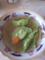 "Ciasto" . Wyjmujemy ciasto na stolnicę. Nastawiamy wodę w garnku. Ciasto należy rozwalkować bardzo cienko, nastepnie pociać na kwadraty o długości boku około 4 cm. Na kwadracie kładziemy farsz, zginamy po przekątnej i łączymy dwa rogi. (Jak uszka do barszczu). Tortellini gotujemy w osolonej wodzie, od czasu do czasu mieszając drewnianą łyżką, przez 3-4 minuty od momentu wypłyniecia na wierzch. 4. Tortellini podajemy w gorącym rosole.